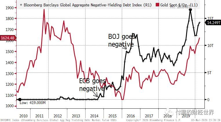 图:负利率债券规模和黄金