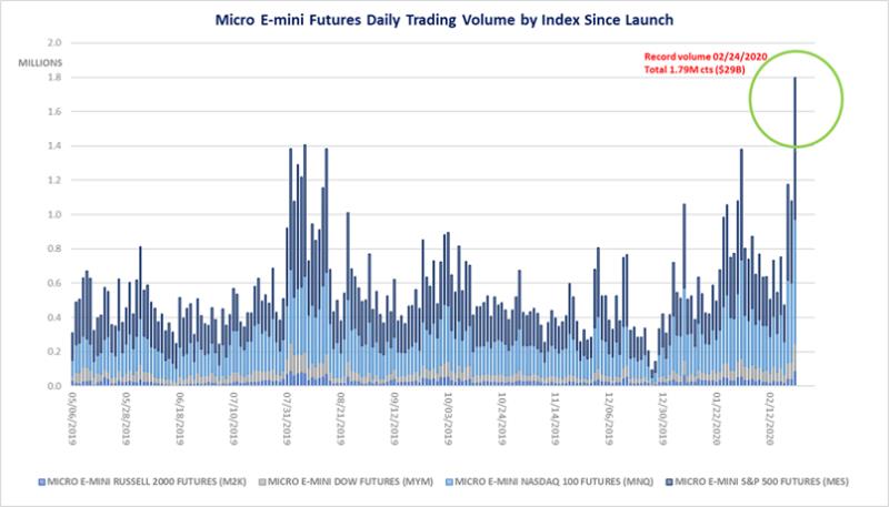 微型e-mini股指期货24日创下了新纪录,共一百七十九万手的总交易量 (请看以下图表) 除了微型e-mini道琼(MYM)之外,其余的微型标普500(MES),微型纳斯达克(MNQ)和微型罗素2000(M2K)都各自创下各自的单日交易量记录