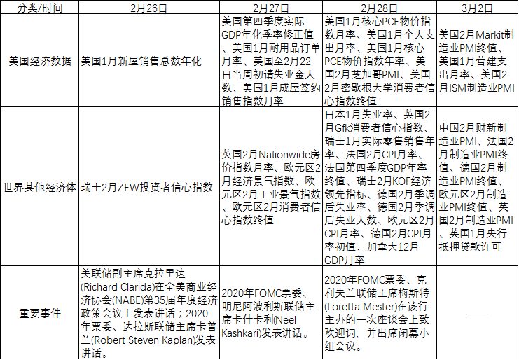 受疫情和担忧经济放缓影响美国私营企业缩减支出,美国2月Markit制造业和服务业PMI均大幅下行;1月CPI不及预期下行,但核心通胀保持强势运行叠加1月PPI大幅超预期或表明在疫情突发前通货膨胀温和增长,但距离目标通胀仍有距离;1月汽车消费反弹支撑1月零售销售上行,但数据显示美国零售业面临较大挑战。从1月零售销售、1月CPI数据和2月Markit服务业PMI来看,美国私人消费支出显现疲态,但就业市场依然保持强劲、楼市投资持续走强,叠加密歇根消费者信心指数显示消费者对美国经济保持乐观积极态度,总体来看,美国经济平稳运行,但受疫情影响美国2月私营企业明显缩减开支,制造业和服务业都面临较大冲击,不排除年内降息的可能性。