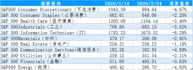 美国时间2月18日至2月24日当周,受疫情蔓延至其他国家影响,市场恐慌情绪显著上升,三大股指全线下挫、大幅下跌,标普500指数所有板块均下行,其中能源、通信服务和可选消费下跌最多。