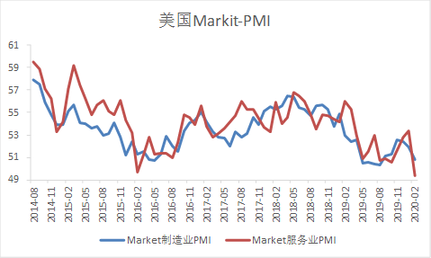 (1)受疫情和担忧经济放缓影响美国私营企业缩减支出,美国2月Markit制造业和服务业PMI均大幅下行。2月21日公布经济数据显示,美国2月Markit制造业PMI初值录得50.8,前值51.9,预期51.5;美国2月Markit服务业PMI初值录得49.4,前值53.4,预期53,美国2月Markit制造业、服务业PMI均不及预期大幅下行。新型肺炎疫情突发事件和行业普遍对经济增长放缓的担忧,令美国私营企业在支出方面更加谨慎。其中制造业PMI虽然还在荣枯线上方运行但创六月以来新低,制造业增速放缓主要由于出口下降和供应链中断,服务业PMI下行至荣枯线下方、服务业四来年首次陷入萎缩区,主要由于旅游和出行需求锐减导致服务业显著恶化,美国私营企业的商业活动在2月总体萎缩。