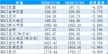美国时间2月18日至2月24日当周,疫情逐渐蔓延至中国以外的地区,市场恐慌情绪再度上升,欧美股市下挫。其中,意大利疫情在欧洲地区最严重,叠加受疫情影响近期公布的欧洲经济数据不及预期,MSCI欧盟和MSCI欧洲区域指数下跌最多。