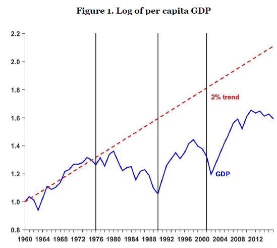 - 1960 - 1974年,经济增长趋势良好,基本与2%的趋势(美国人均产出的长期增长率)一致。