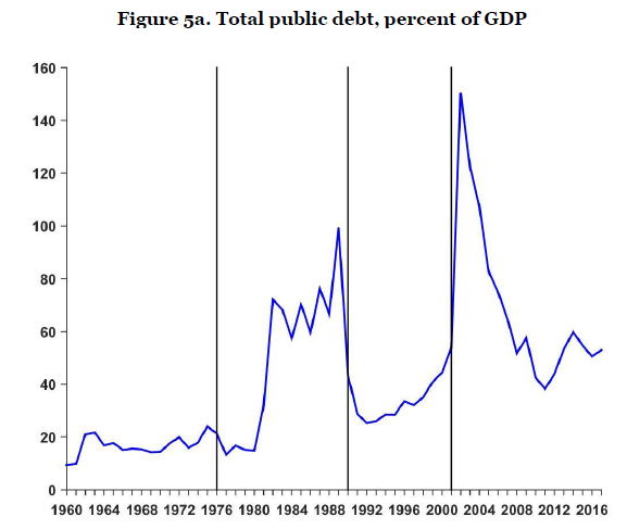 20世纪90年代初期,随着政府重返国际资本市场,债务再次开始增长(年均增长10%)并一直持续到2001年的危机。债务在2002 - 2004年急剧增加,并于2005年急剧减少。这些波动背后是危机带来的财政成本(债务增加)以及随后的债务重组中对于资本的大幅削减(债务减少)。