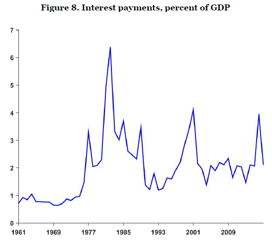 在图8展示了总付息GDP占比。如图所示,在两次违约中,付息GDP占比非常之高。1981年第一次违约时,恰逢美国的实际利率高企。但在2001年第二次违约时,国际无风险利率并没有明显飙升。这表明投资者预期到违约风险时,会要求更高的利率。尽管可以用利率的变动来解释图8中付息的变化,但应考虑债券所遵循的会计惯例,支付的利息总额取决于债券的发行种类的票息。而在20世纪90年代初的债务重新谈判时,有一些债券的结构是设计为到期一次性还本付息,这一特征也解释了20世纪90年代后半期这一数字急剧增加的部分原因。