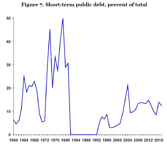 债务的期限结构也是值得讨论的特征。图7通过展示一年内到期的债务占总债务的份额,描绘了政府债务期限的结构,历年来发生了多次重大变化。1970年代后期的稳定期继承了高度偏向于短期债务的期限分布。几乎三分之一的债务是在一年内到期的。短期债务的累积最终导致违约,因此展期风险可能是债务危机的重要导火索。