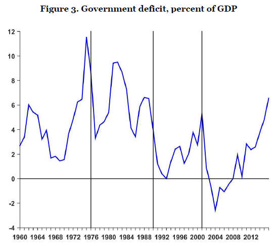 而对真实货币的需求,在一般价格水平 (general price level)、短期名义利率 (short-term nominal interest rates)、总实际收入 (total real income) 和一些货币计量 (measure of money) 之间建立了系统性联系。系统性的增加货币供给会带来通胀。上述两个观点, 并不意味着持续的赤字必然导致通胀,因为政府(在增加货币供应之外)可以通过增加负债来为赤字融资。但发债意味着政府承诺未来的盈余将被用于偿还债务。如果这些承诺缺乏可信度,政府可能会面临借款能力的限制。结合两种观点,财政赤字与通胀之间存在直接联系。因此,付息债务相对于GDP的规模至关重要。