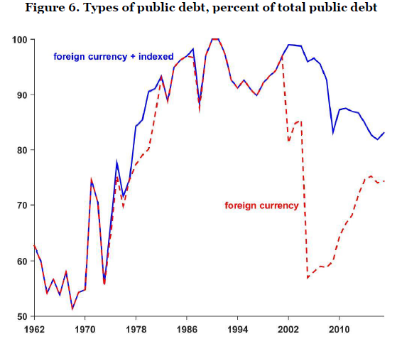 为了进一步理解前两个数字,在图6中,红线为外币计价债务在政府债务中的比例,蓝线则为外债加上抗通胀债务后的比例。在20世纪60年代,比索计价债务的份额不低,约占债务总额的三分之一(译者注:以比索计价的债务比例则为100%减去图中所示外币的占比),但到了高通胀时期,几乎所有政府债务都以外币计价。比索计价的债务在1990年代略有增长,但在2001年的危机之后再次“消失”。此外, 20世纪90年代发行的大部分以比索计价的债务不是抗通胀债券,而在2000年代后发行的则多为抗通胀债券。