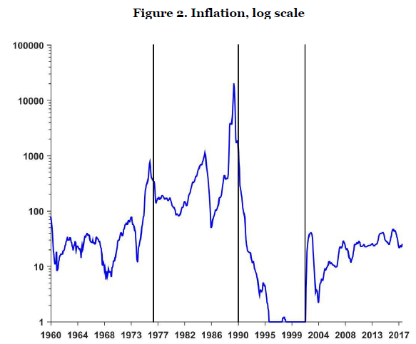 图2展示了全时期的通胀率(译者注:因阿根廷经历过恶行通胀,为更准确观测非恶性通胀年间的通胀率,图2左侧的坐标系数并非等比例绘制,且将每年较前一年的通胀率除以12作为月通胀率进行绘图;以年为单位等比例绘制的通胀率见图2b)。自1960年起的第一个十年中通胀相对温和,但在其后十五中逐渐失控,一直持续到1991年货币局制度的实行(将汇率与美元挂钩)。1991年后的十年,是阿根廷唯一与发达国家通胀率相似的时期,年均通胀率为2.7%。随着2002年初货币局制度的惨痛“破产”,通胀率又回升1960年代后期的水平。