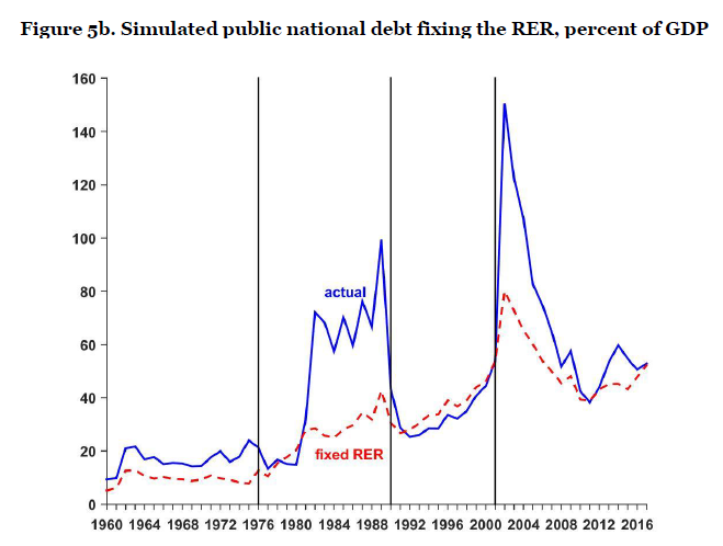 图5b 公共国家债务在GDP中的占比,真实浮动RER和固定RER
