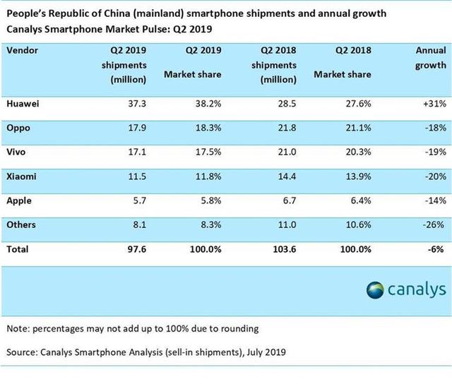 根据市场研究公司Canalys第二季度中国内地智能机市场统计报告显示,华为第二季度在中国市场的智能机出货量飙升,达到3730万部,较上年同期的2850万部增长31%,市场份额达到了38.2%。而小米智能手机同比下降了20%,市场份额下降到11.8%。