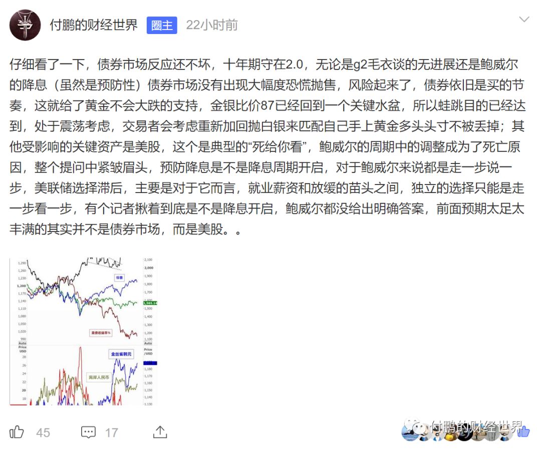 仔细看了一下,债券市场反应还不坏,十年期守在2.0,无论是g2毛衣谈的无进展还是鲍威尔的降息(虽然是预防性)债券市场没有出现大幅度恐慌抛售,风险起来了,债券依旧是买的节奏,这就给了黄金不会大跌的支持,金银比价87已经回到一个关键水盆,所以蛙跳目的已经达到,处于震荡考虑,交易者会考虑重新加回抛白银来匹配自己手上黄金多头头寸不被丢掉;其他受影响的关键资产是美股,这个是典型的“死给你看”,鲍威尔的周期中的调整成为了死亡原因,整个提问中紧皱眉头,预防降息是不是降息周期开启,对于鲍威尔来说都是走一步说一步,美联储选择滞后,主要是对于它而言,就业薪资和放缓的苗头之间,独立的选择只能是走一步看一步,有个记者揪着到底是不是降息开启,鲍威尔都没给出明确答案,前面预期太足太丰满的其实并不是债券市场,而是美股。。
