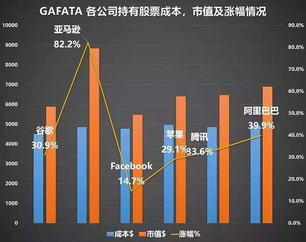 从这张图上可以看出,亚马逊继续以82.8%(上月69%)保持涨幅榜第一,其次是阿里39.9%(上月46%),腾讯33.6%(上月29.2%),谷歌30.9%(上月24.8%),苹果29.1%(上月19.7%),最后是脸书14.7%(上月12.6%)。