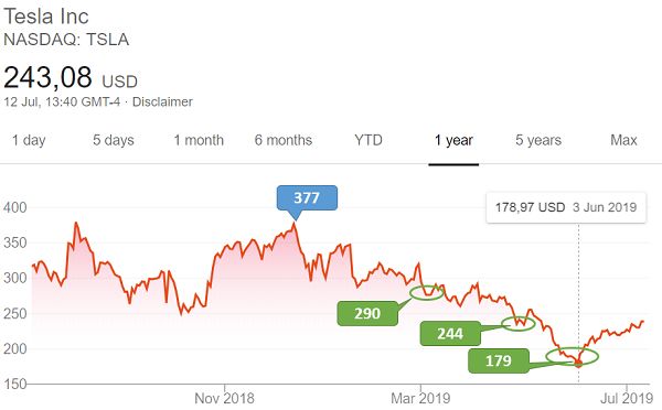 $特斯拉(TSLA)$ 的股票最近一年以来可以说像是在坐过山车,2018年8月达到接近380美金,随后跌到250美金;12月再次冲到接近380美元,而今年年初以来却一路下跌,跌到6月初的谷底只有178美金,跌幅超过50%。