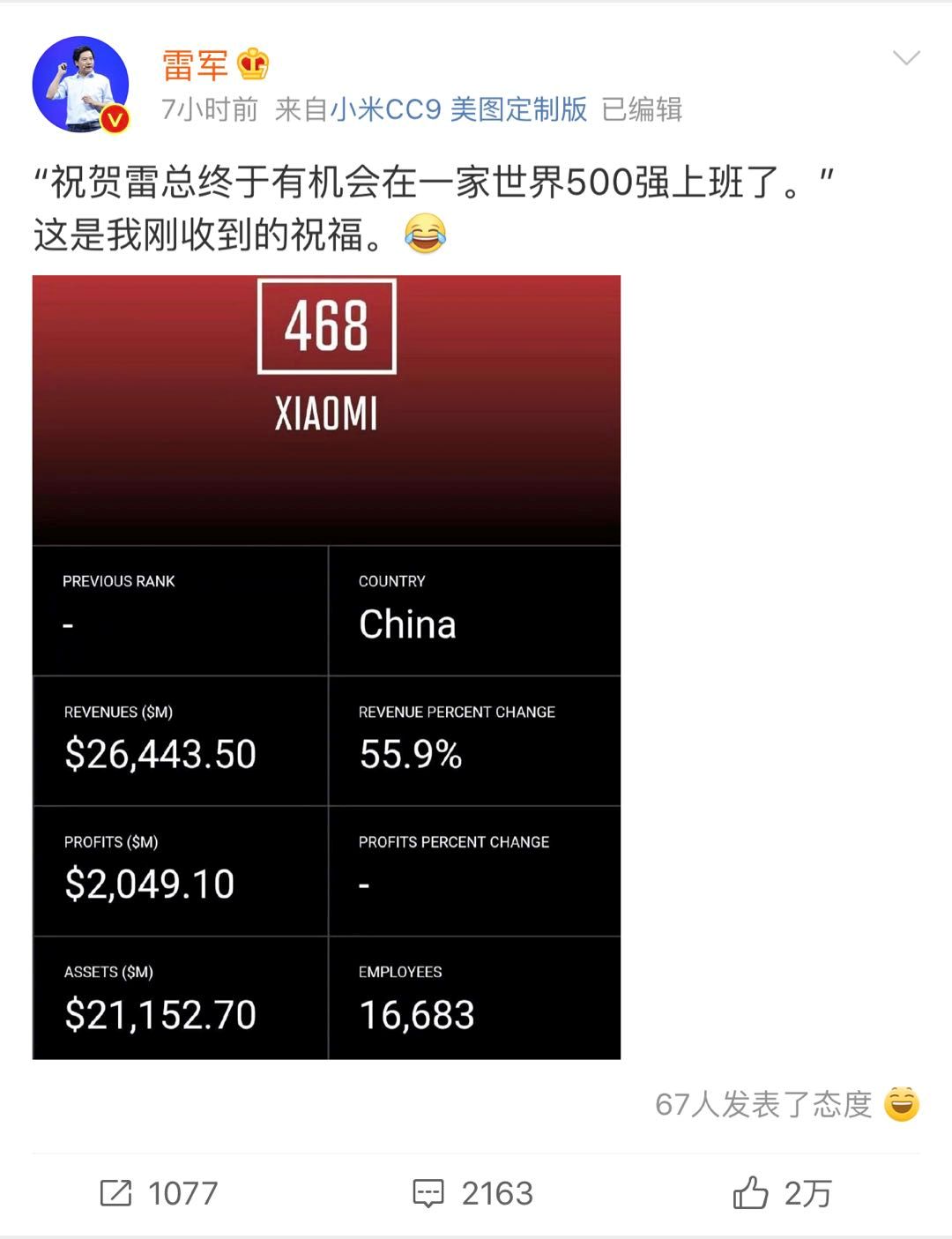《财富》杂志刚刚公布了最新世界500强公司排行榜,小米上榜了!我们在全球排名468位,是“互联网服务与零售”分类中的7家公司之一,同时成为了有史以来最年轻的世界500强公司(除了合并产生的公司外),从创业至今才9年时间,这是一个了不起的成就!