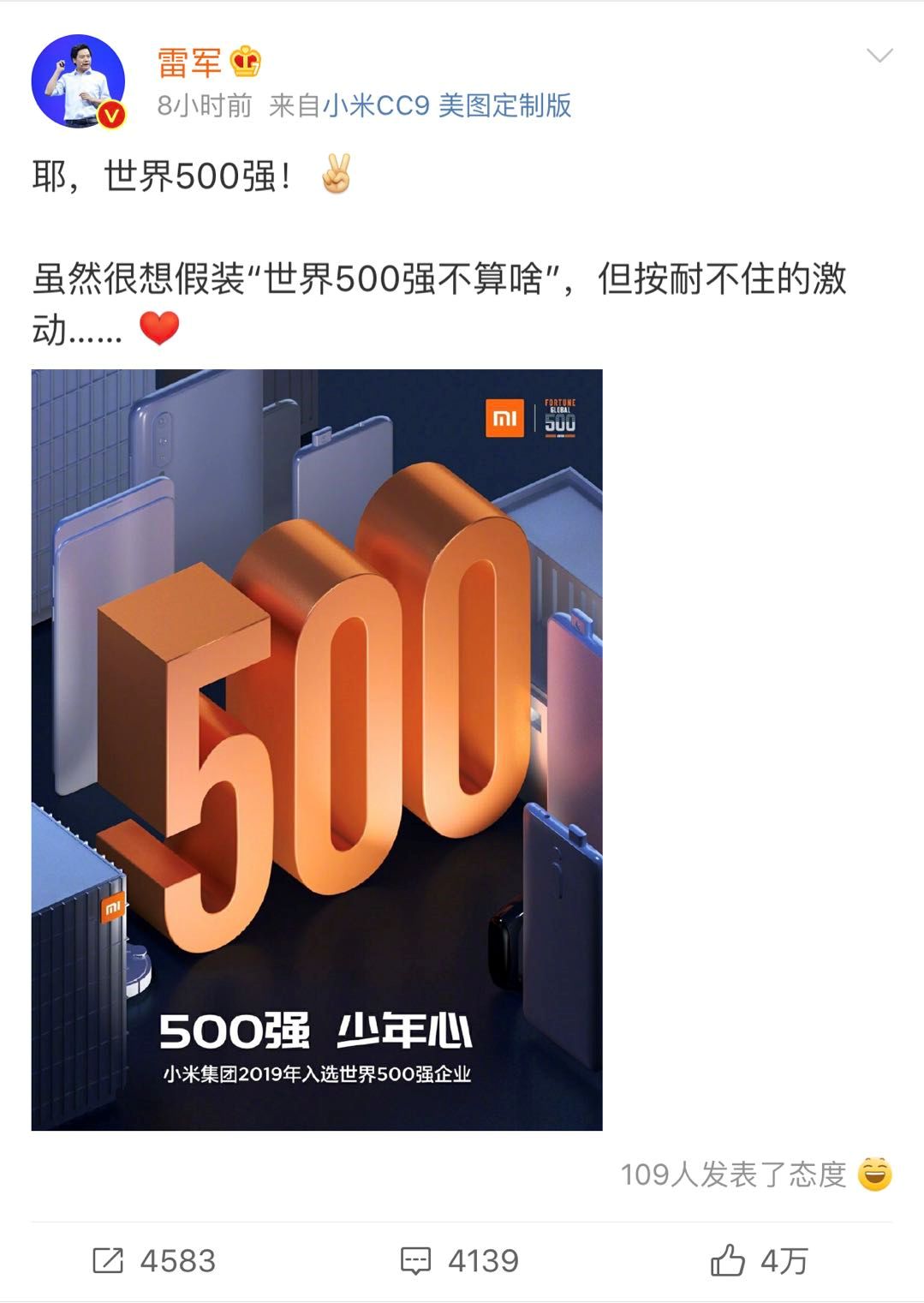 公司上榜世界500强加上北京总部新园区的启用,双喜临门。我们由衷感谢所有相信小米、支持小米、帮助小米、鞭策小米的朋友们。