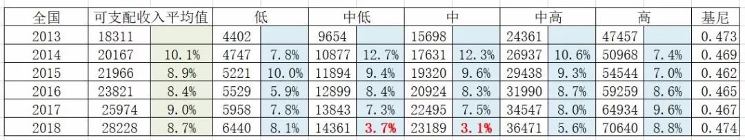 关于基尼系数,除了统计局的官方数据,还有两套间接数据可以判定,一是五档收入居民的收入增速,看富人的增速快,还是中低收入者的增速快;二是用可支配收入中位数与可支配收入平均数的比例来判定,比例越大贫富分化越小,反之亦然。