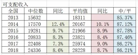 这是可支配收入中位数和平均数的比例关系。2014-2015比例在扩大,2016-2018比例在缩小。