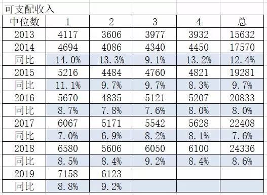 这是季度数据。2019前俩季度,中位数/平均数的比例在提高,表明经过三年的贫富分化扩大之后,趋势终于开始反转了。
