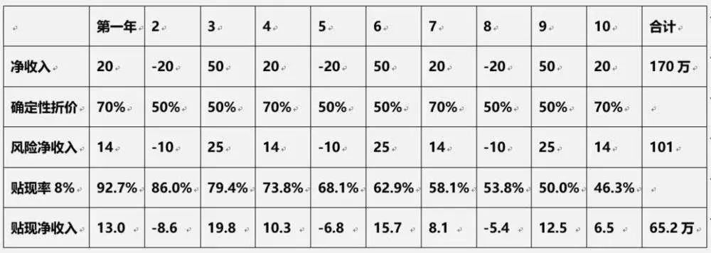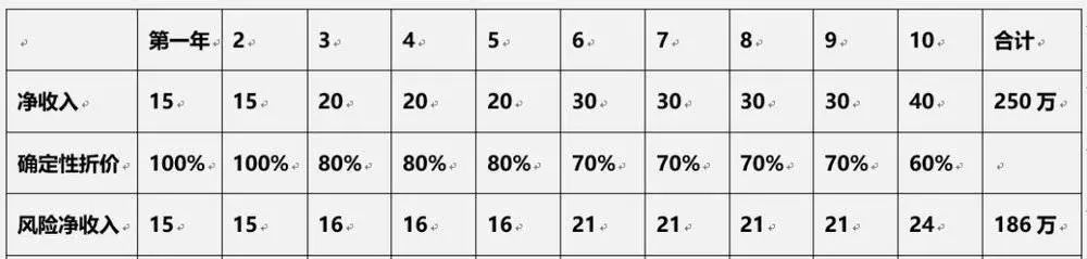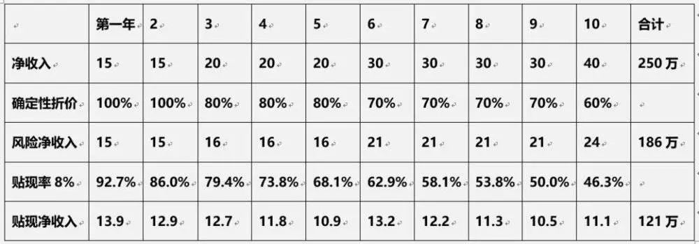 最后我们得到了一个打了折的“风险净收入”,十年合计186万。