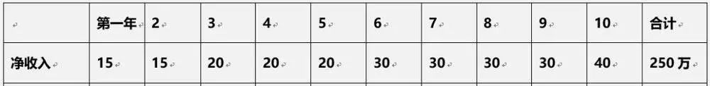 第一步,按照名企员工正常的收入递增标准,得到了他未来十年的总净收入,如下表: