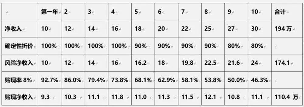 这就完了吗?还有最后一步,因为未来的钱折算到现在是要打折扣的,就是“贴现”,假设你的投资能力不错,那贴现率也要高于正常利率,我们假定为8%,那贴现的计算方法就是,第一年除以1.08,第二年除两次1.08……,第十年连除十次1.08,得到下表每一年的净收入贴现额,最后十年总计为121万,如下表: