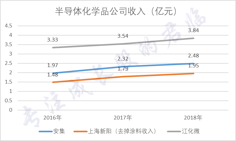 上海新阳的总收入3者中最高,但其大部分收入来自收购的涂料公司,真正的半导体化学品收入3者中最低。