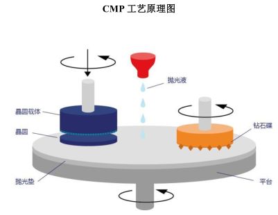 化学机械抛光的原理是用抛光液和晶圆表面的物质发生化学反应,然后再利用抛光液中的颗粒物以及抛光垫的相对运动把不要的部分打磨去除。