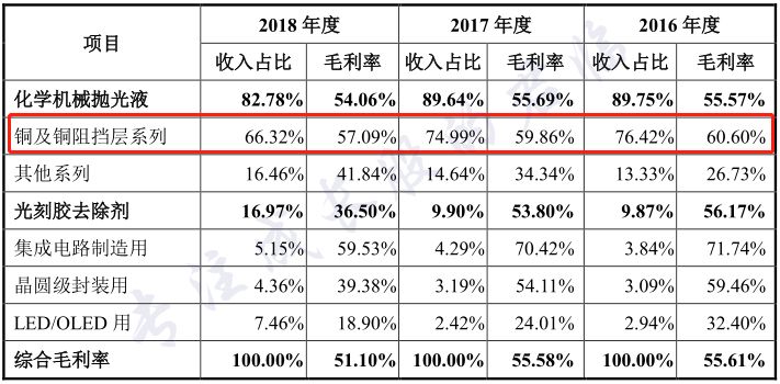 毛利高的原因在于铜抛光液毛利率很高,而其铜抛光液在过去3年的销售占比又高达76.42%、74.99%、66.32%,所以带着综合毛利率也很高。