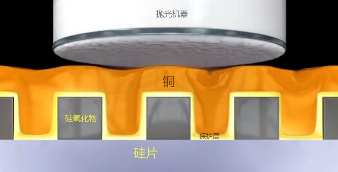 首先是给整个晶圆都镀上一层铜,但我们真正需要的只是在沟槽里的那部分铜就可以了,那些沟槽也就是已经规划好的导线路径,这时候就要用到化学机械抛光(CMP)把沟槽之外的铜打磨掉。