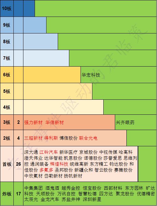 图中标的剔除新股和ST,绿色背景为炸板或进阶失败个股,其他颜色背景为对应高度涨停个股。红色字体为主观选择的对应高度核心股,每个高度不超过三只,便于观察市场情绪变化和结构走向,非投资建议。