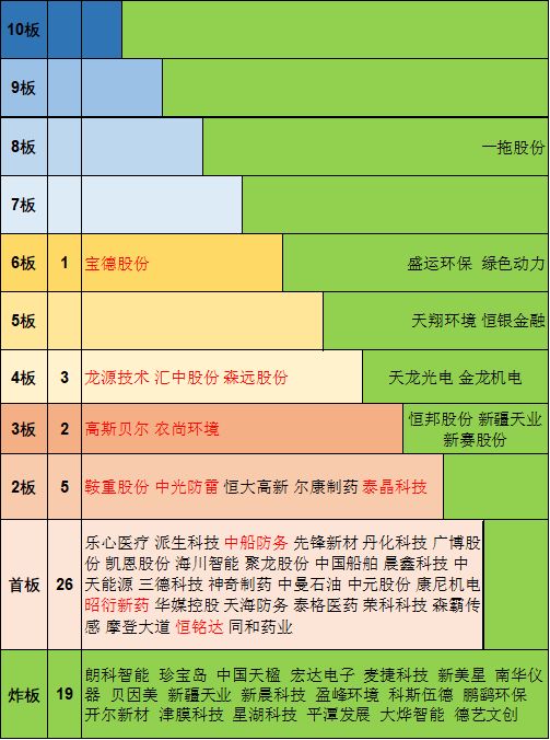 图中标的剔除新股和ST,绿色背景为炸板或进阶失败个股,其他颜色背景为对应高度涨停个股。红色字体为主观选择的对应高度核心股,每个高度不超过三只,便于观察市场情绪变化和结构走向,非投资建议。