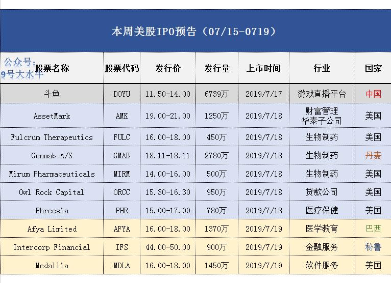 本周将迎来10只新股,分别来自5个国家,除了中国武汉的电子竞技公司斗鱼(DOYU)以外,还有丹麦,秘鲁,巴西,纷纷来到美股上市,一场国际化的美股玩家,齐聚一堂,本周IPO的冠军花落谁家?
