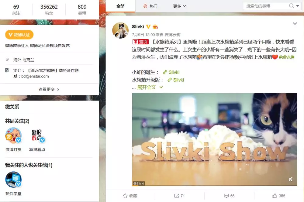 除此之外,还有一些个人博主选择自主进入,比如乌克兰的Slivki show,2017年就开始在新浪微博上推送带有中文字幕的内容。
