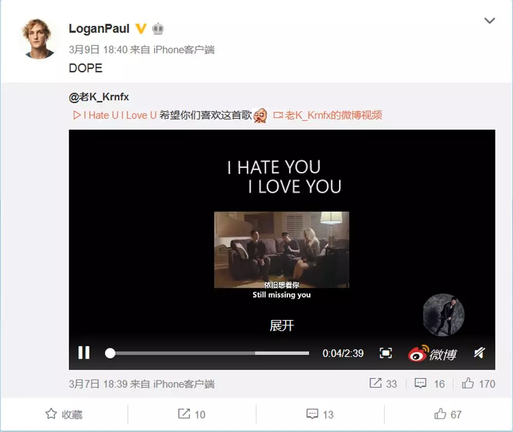 Logan Paul的个人微博拥有50万粉丝,但最近一条更新已是3月9日。Slivki show的微博还在更新,但频率只有一天一条,而且互动和播放都不是很理想。