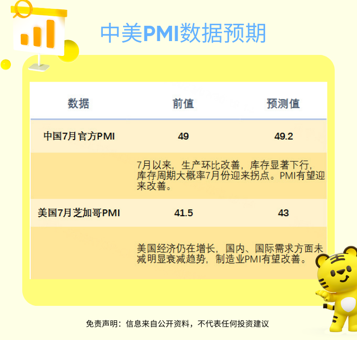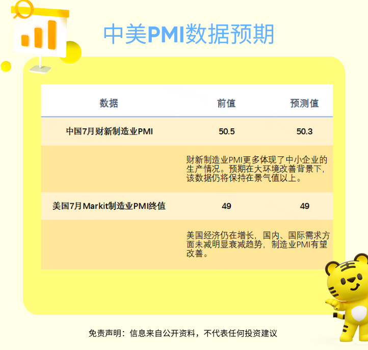 重点数据:中国7月官方制造业PMI、非制造业PMI、综合PMI;美国7月芝加哥PMI、7月达拉斯联储商业活动指数。