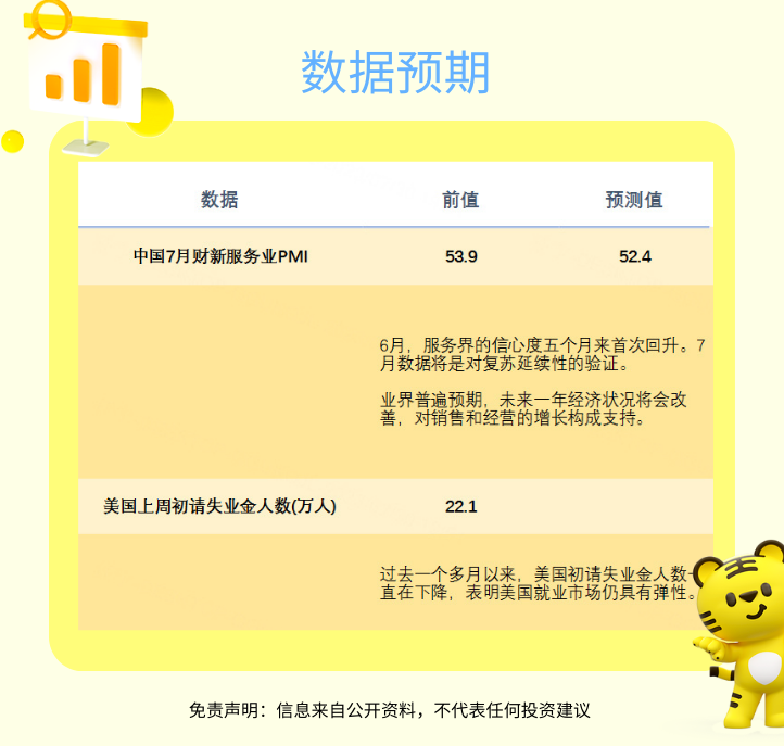 经济数据方面,中国7月财新服务业PMI、美国当周初请失业金人数等将陆续公布。