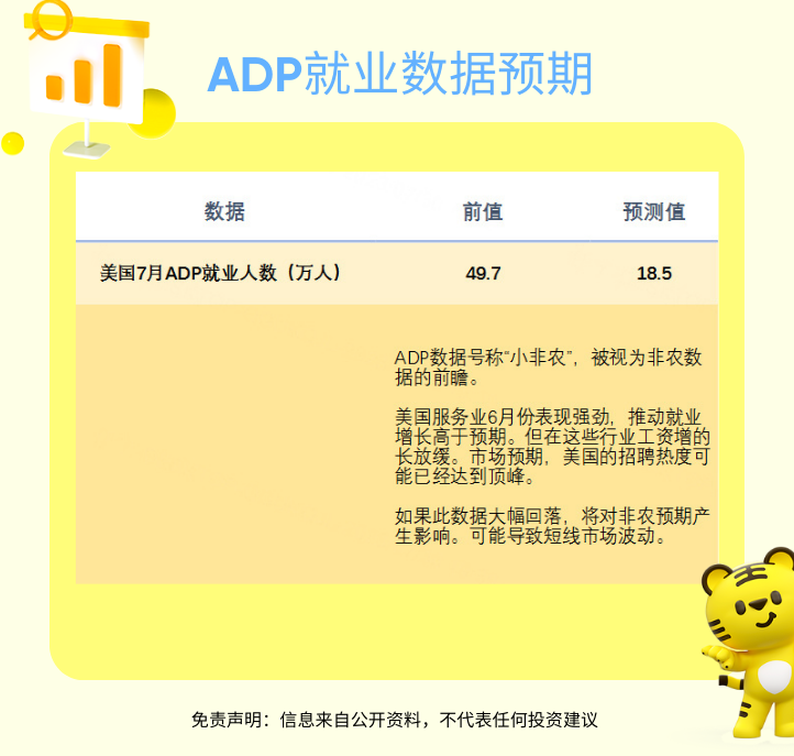 经济数据方面,美国将公布7月ADP就业人数。