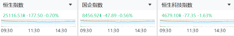 受中东地缘局势升温及外围科技股走弱拖累,今日港股三大指数承压回调。恒生指数收报25,116.53点,日内下跌0.70%;国企指数收报8,456.92点,跌0.56%;以科网股为主的恒生科技指数表现最弱,收报4,679.10点,跌1.63%。