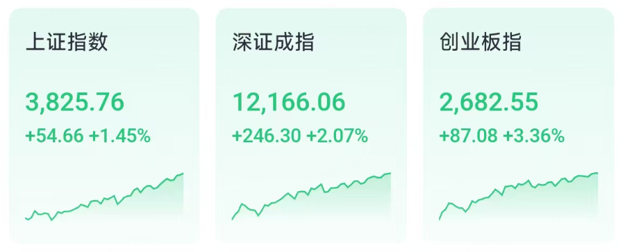 截至收盘,沪指涨1.45%报3825.76点,成交10951亿元;深成指涨2.07%报12166.06点,成交14336亿元。创业板指上涨3.36%,报2682.55点。