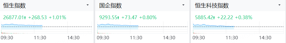 1月13日,港股三大指数齐涨,截止午间收盘,恒指涨1.01%,科指涨0.38%,国指涨0.80%。