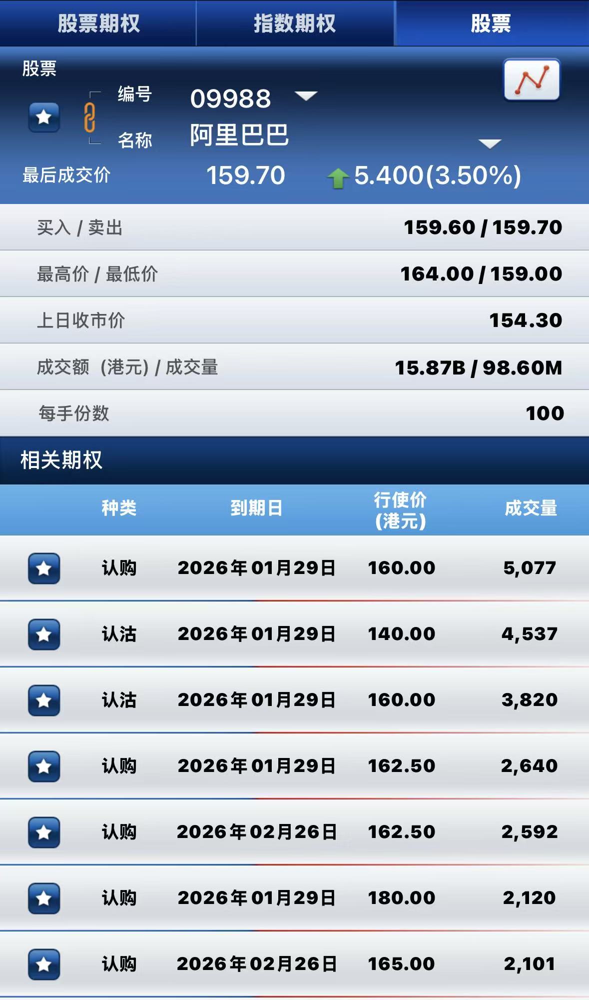 阿里巴巴-W上涨3.5%,期权方面:半日成交超9.5万张合约,其中于1月29日到期行权价160港元的认购期权成交量居前,成交超5000张合约。 $ALB.HK 20260129 160.00 CALL$