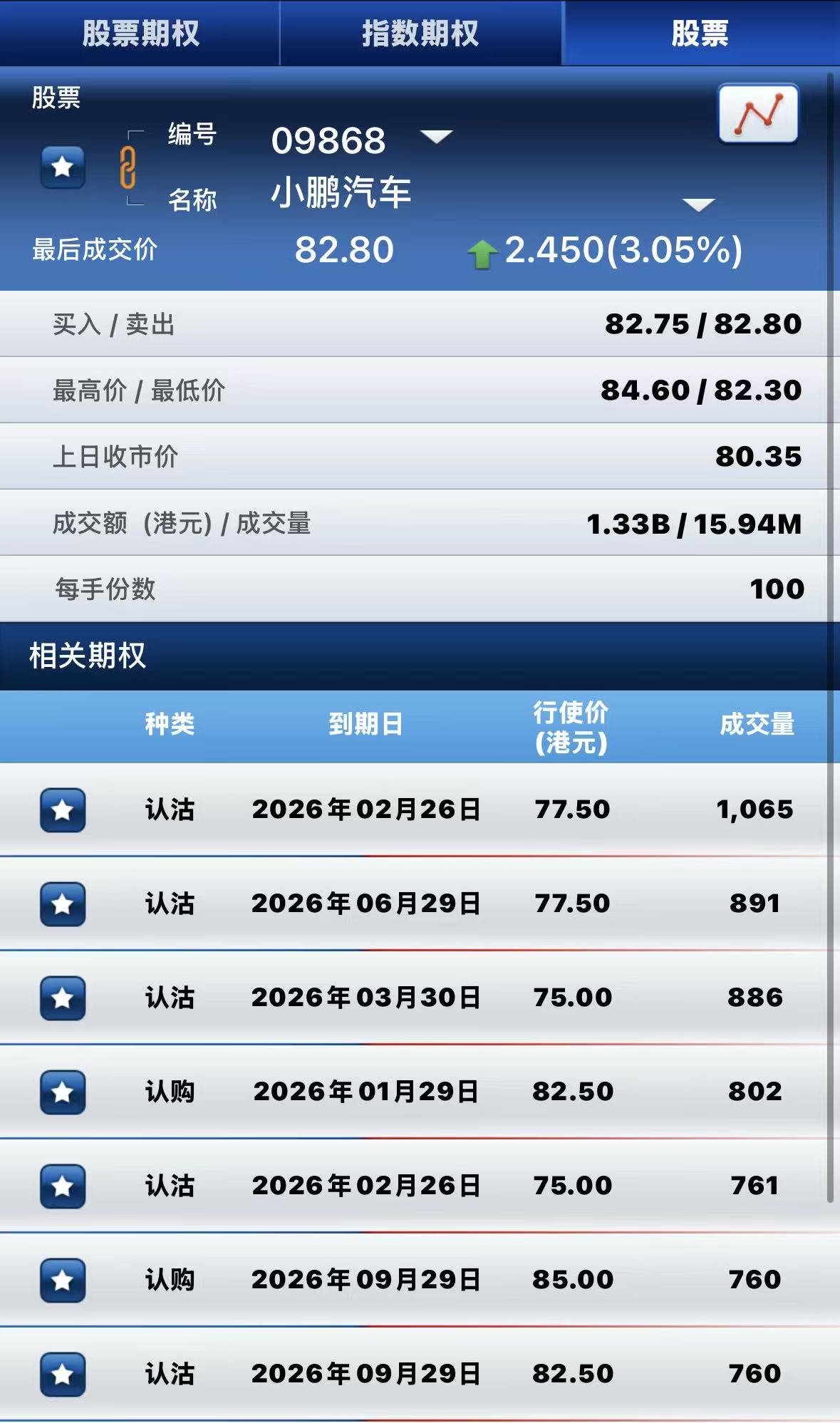 小鹏汽车-W涨超3%,期权方面:半日成交近2.4万张合约,其中于2月26日到期行权价77.50港元的认沽期权成交量居前,成交超1000张合约。 $PEN.HK 20260226 77.50 PUT$