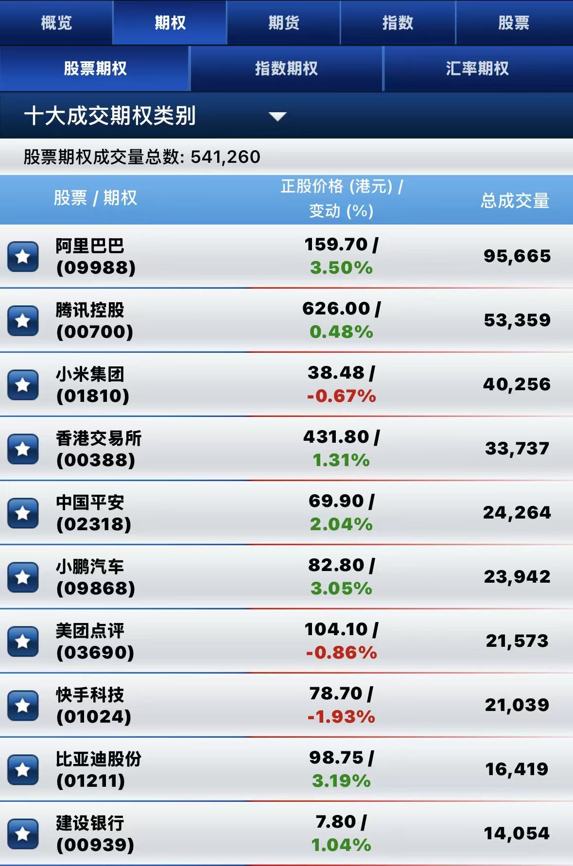 港股期权半日成交超54万张。其中,阿里巴巴-W成交量居前,期权成交超9.5万张;腾讯控股名列次席,期权成交超5.3万张; 小米集团-W位居第三,期权成交超4万张。