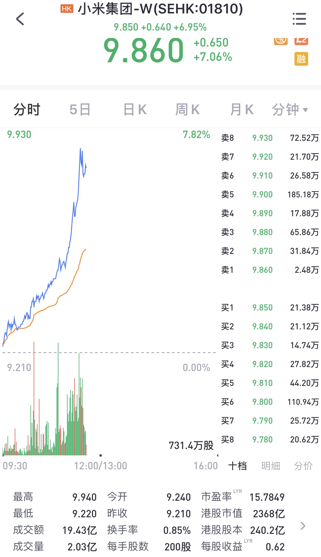 12月11日,$小米集团-W(01810)$ 股价高开高走,放量大涨,涨幅一度达7.82%,股价最高触及9.93港元,距离10元只有一步之遥。截至发稿,股价有所回落,成交额放大至19.13亿港元。分析认为,小米股价的大幅飙升,或源于昨日Redmi推出1999元最便宜5G手机K30,紧握5G时代门票。