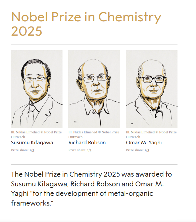 当地时间10月8日,瑞典皇家科学院决定将2025年诺贝尔化学奖授予北川进(Susumu Kitagawa)、理查德·罗布森(Richard Robson)以及奥马尔·M·亚吉(Omar M. Yaghi)三位科学家,以表彰其在金属有机骨架开发领域的贡献。获奖者将平分1100万瑞典克朗(约合836万元人民币)奖金。