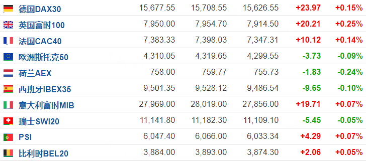欧洲主要股指涨跌不一,截至发稿,德国DAX30指数涨0.15%,法国CAC40涨0.14%。原油