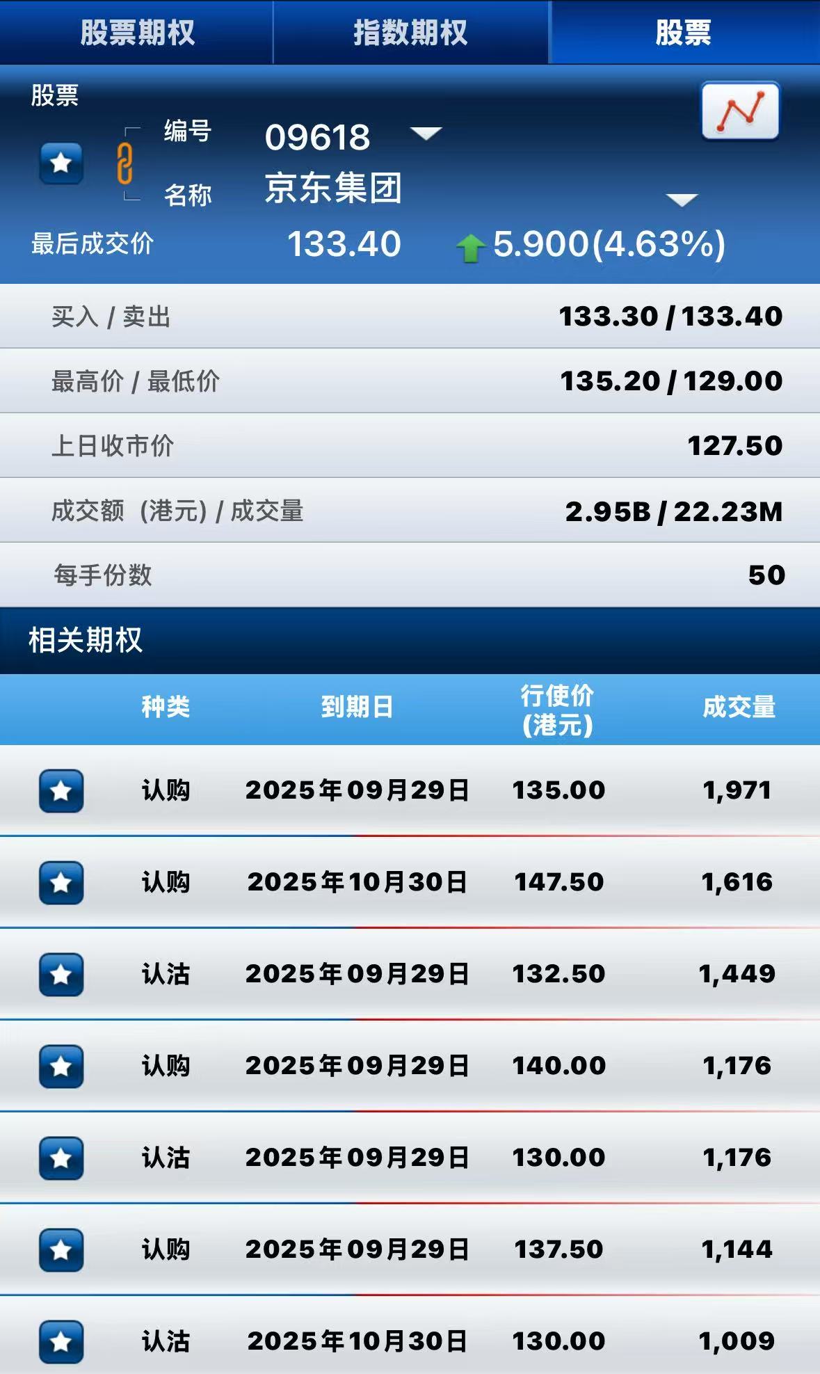 京东集团-SW涨超4%,期权方面:半日成交超2.9万张合约,其中于9月29日到期行权价135港元的认购期权成交量居前,成交超1900张合约。 $JDC.HK 20250929 135.00 CALL$