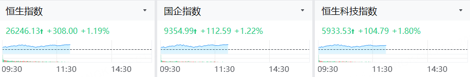 9月10日,港股上午盘三大指数继续强势上涨,截止午盘,恒生指数涨1.19%站上26000点上方,恒生科技指数涨1.80%,国企指数涨1.22%。