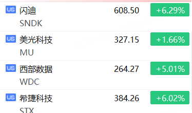 3月31日,存储概念股盘初走高,闪迪、希捷科技涨超6%,西部数据涨超5%,美光科技涨超1%。